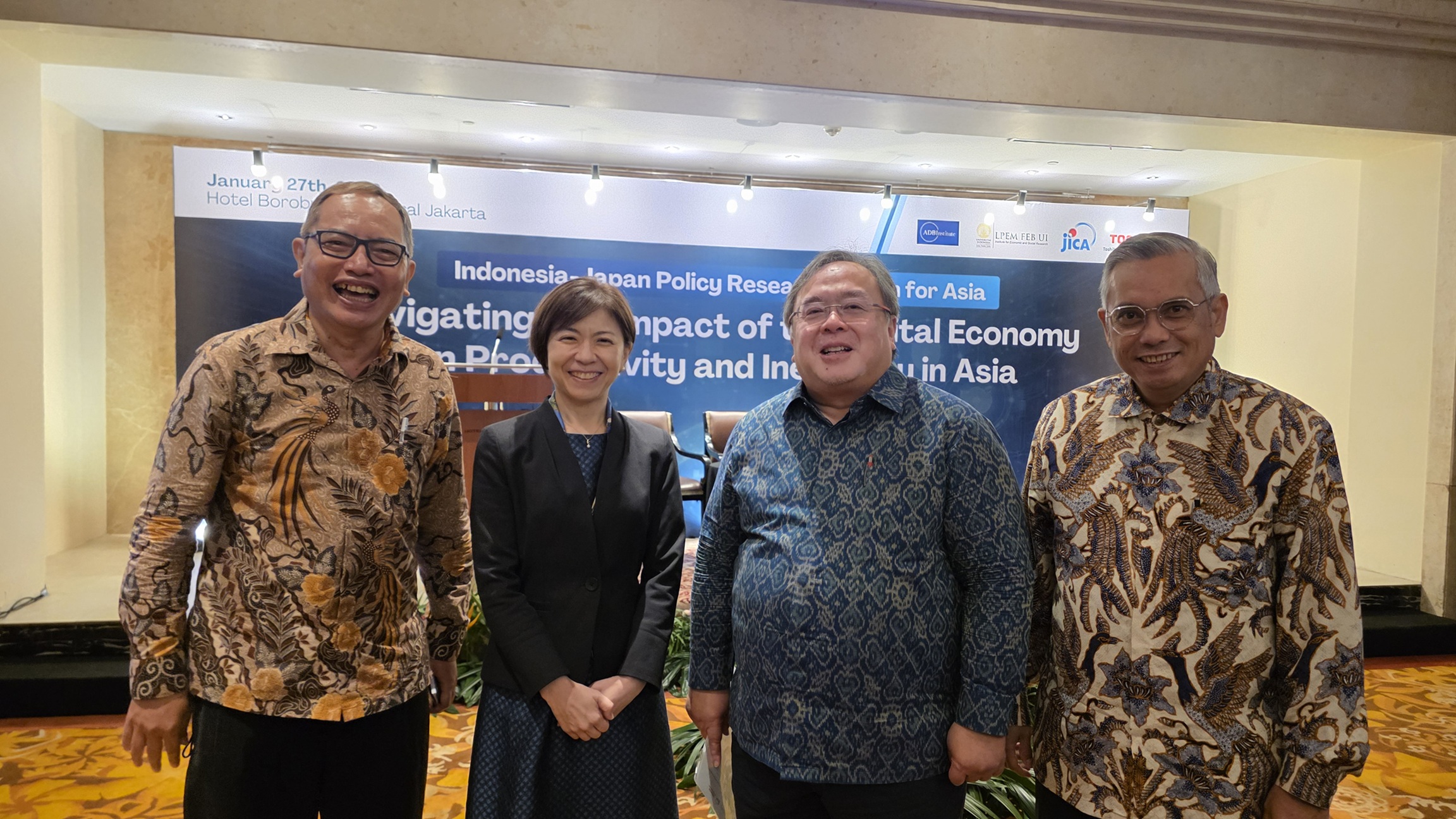Ki-ka 左右: kang Fuad (Chairman, KAJI), Mrs. TAKEDA Sachiko (Chief Representative, JICA Indonesia Office), Prof. Bambang Brodjonegoro (Dean, ADBI), DR. Kiki Verico (Vice-Dean, FEB UI).