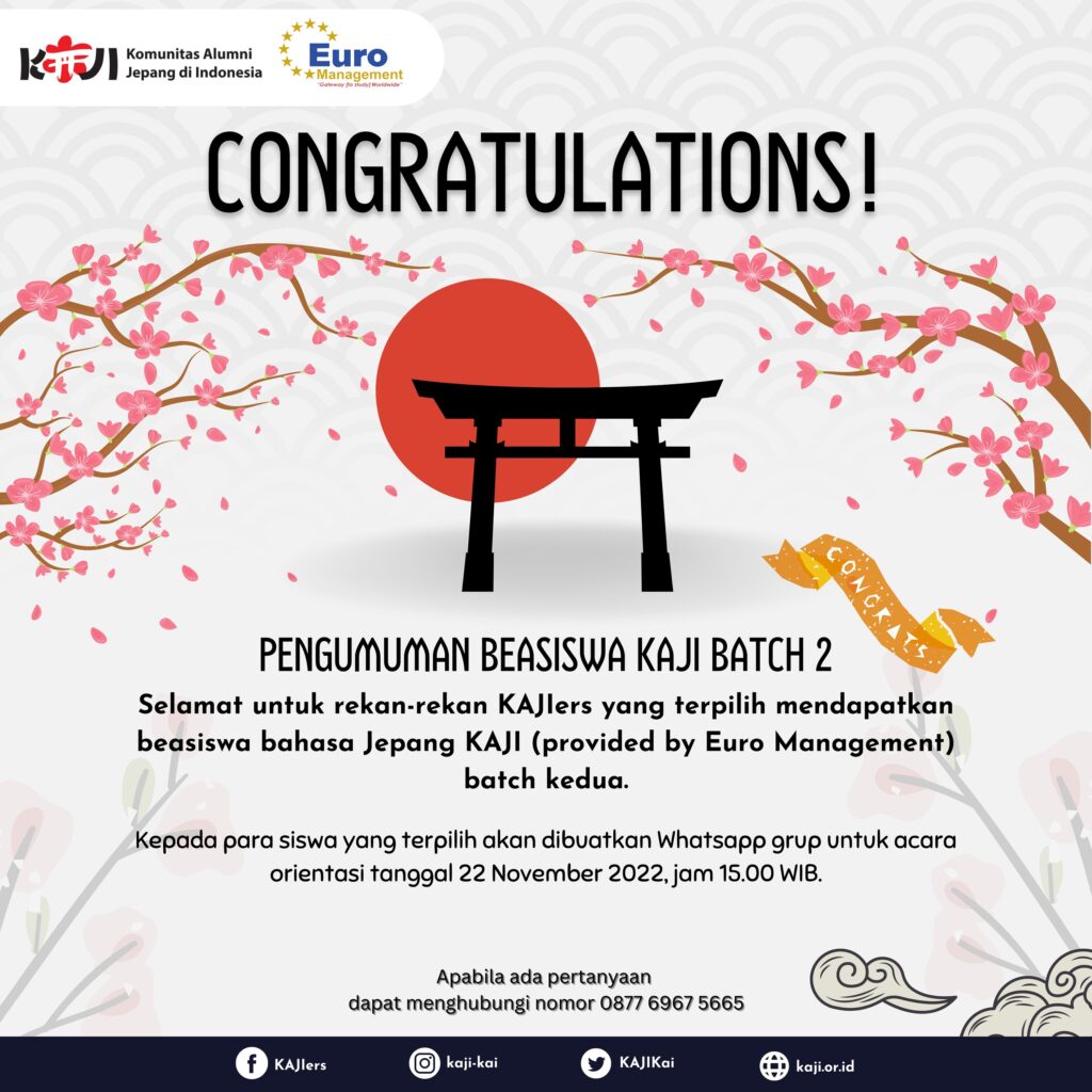 Ayo segera daftarkan diri mu dan ajak teman lainnya! ?? ?Online, kuota terbatas ?Batas pendaftaran 5 Oktober 2022 ?Link Pengumuman beasiswa KAJI Batch 1! KAJI奨学金第1期の発表! Congratulations!!! ? おめでとうございます!!! ️ Selamat untuk rekan-rekan KAJIers yang terpilih mendapatkan beasiswa bahasa Jepang KAJI (provided by Euro Management) batch pertama. KAJI 日本語奨学金(Euro Management 提供)の第 1 期生に選ばれた仲間の KAJIers の皆さん、おめでとうございます 。 Kepada para siswa yang terpilih akan dibuatkan Whatsapp...